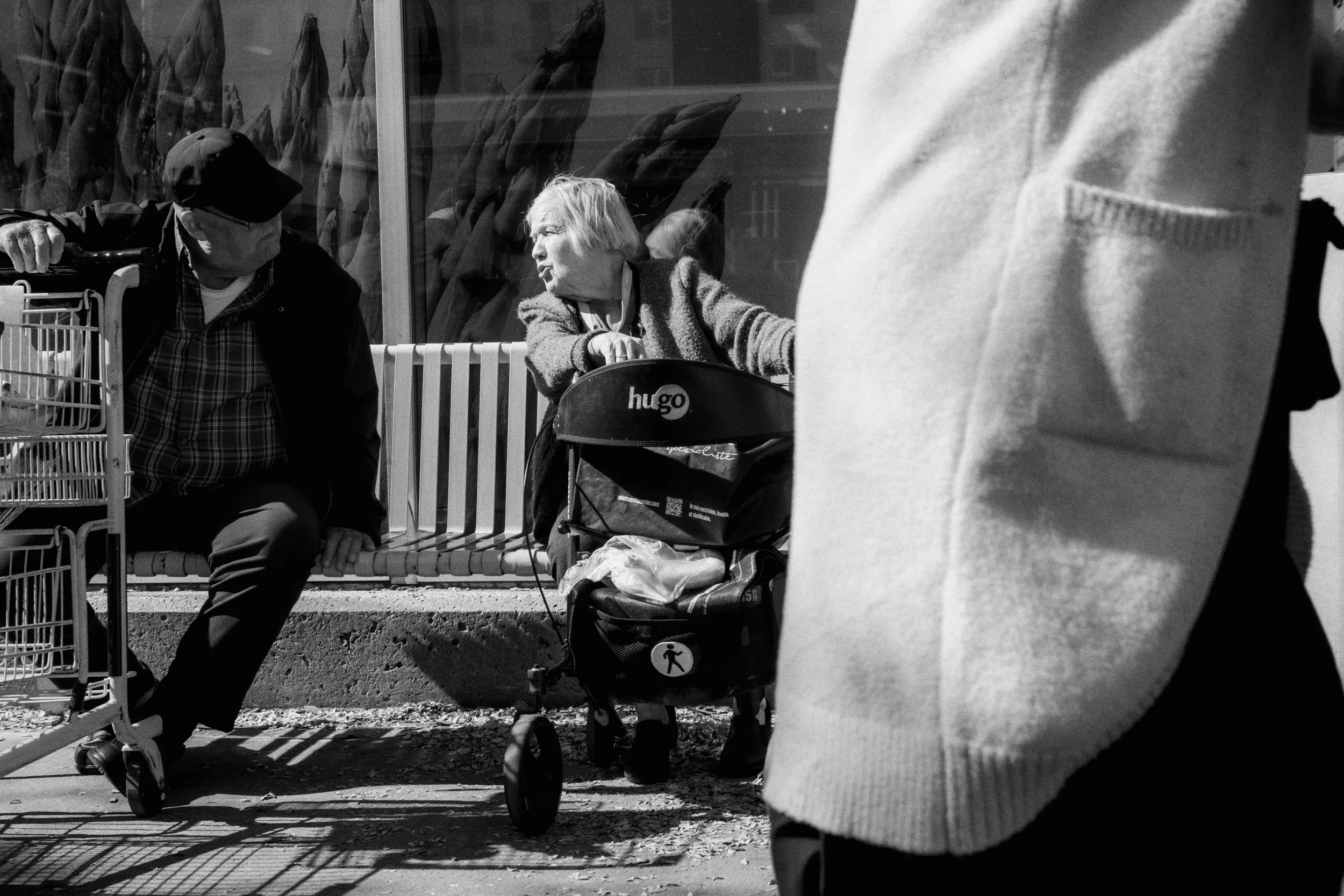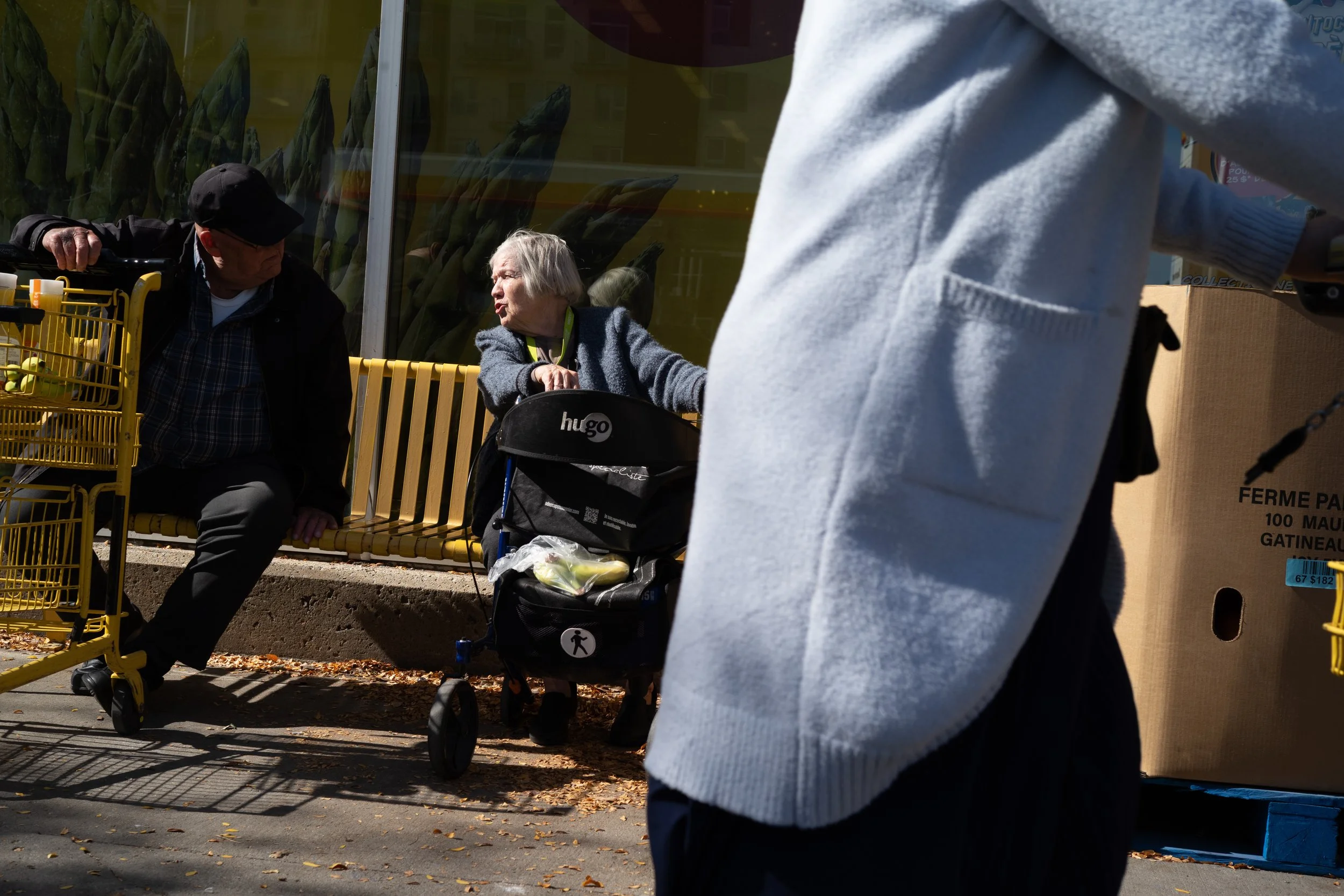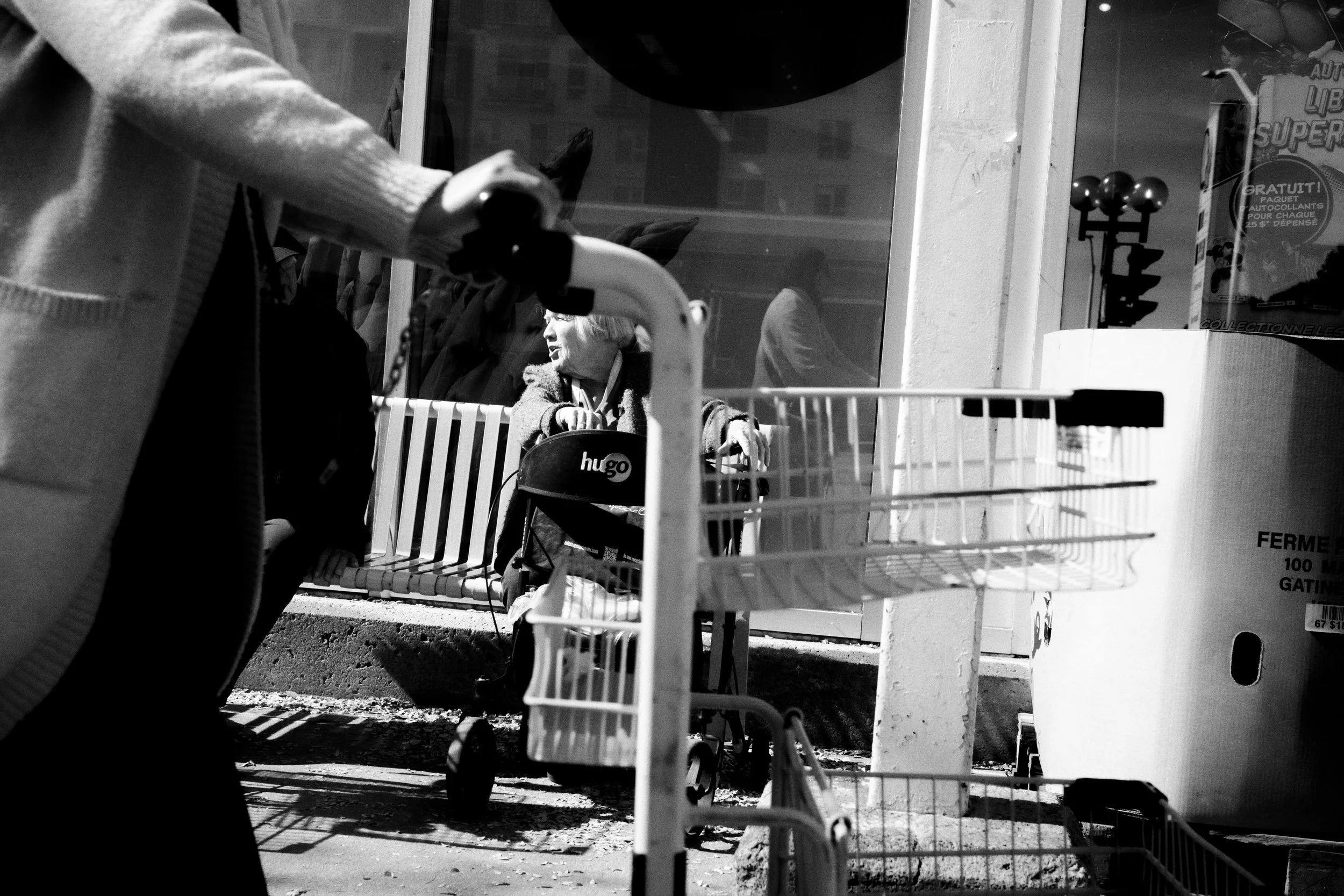 Je suis nul pour faire des choix. Dans le dictionnaire, à la définition de « indécis », il y a ma photo. À moins qu’il y ait un problème précis entre deux images semblables, c’est difficile de choisir. Mon processus d’édition, ce sont de longues heures d’indécision qui se terminent généralement par moi gardant les deux images, « au cas où ». Par exemple, ici, oui la première photo est techniquement meilleure : on voit clairement les deux sujets avec un passant à droite qui encadre la scène. Mais l’autre a plus de caractère, semble plus originale même si elle est techniquement imparfaite : la dame est partiellement cachée par le chariot d’épicerie et on distingue à peine le monsieur avec qui elle parle. Toutefois, dans la vitrine, on voit le reflet du propriétaire dudit chariot. Décision, indécision. À l’ère du numérique, ce problème (le mien) s’aggrave puisque l’on peut prendre un nombre infini de photos du même sujet, puis vient l’édition où la décision devient impossible. Au moins avec l’analogique, il y a rarement plus de deux photos à comparer.