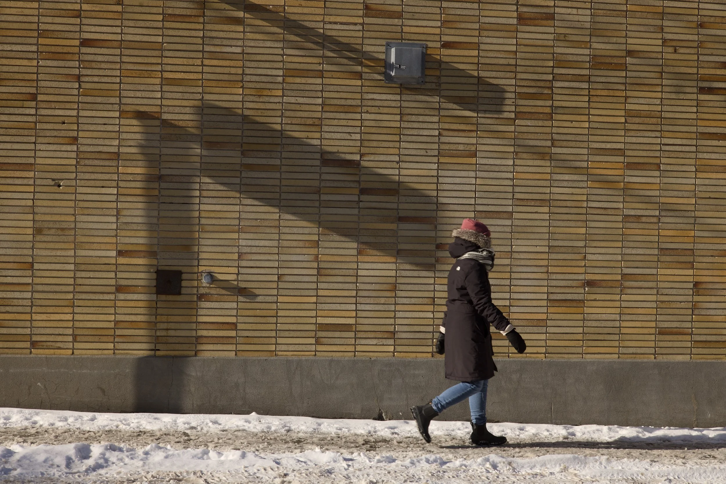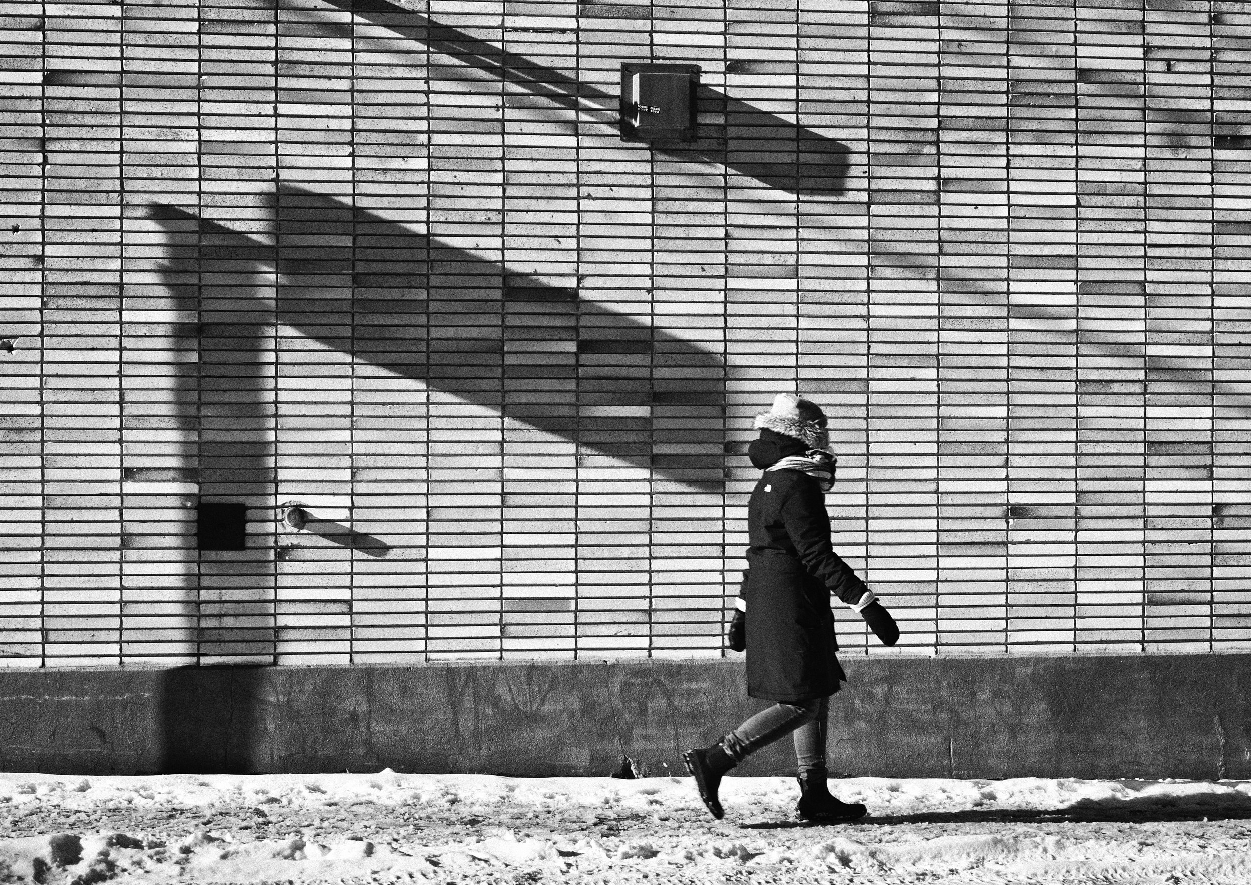 I could and do say a lot of bad things about winter in Canada: it’s always grey, monochromatic, it’s cold, the days are too short, it seems to last forever. For a photographer, it’s quite boring, always the same light that makes your subject very flat and shapeless. I complain, but it does force you to look for new subjects and new ways to depict them. However, on the rare occasion you get a sunny day, and when you do, it is glorious. In a northern country, the sun never gets high on top of your head like in the summer; it’s always at an angle from 8 a.m. to 4 p.m. when it disappears. Like here, it’s past 2, and if in the summer it would be an impossible shot with the sun on top of us. But here it creates this great shadow in harmony with the passerby. Of course, the gods giveth and taketh away, since a very nice sunny day in the winter means impossible temperatures that kill your battery and your physical willingness to withstand -20°C for too long. But look at that shadow!! I guess that’s why the gods also invented coffee breaks and gloves. //