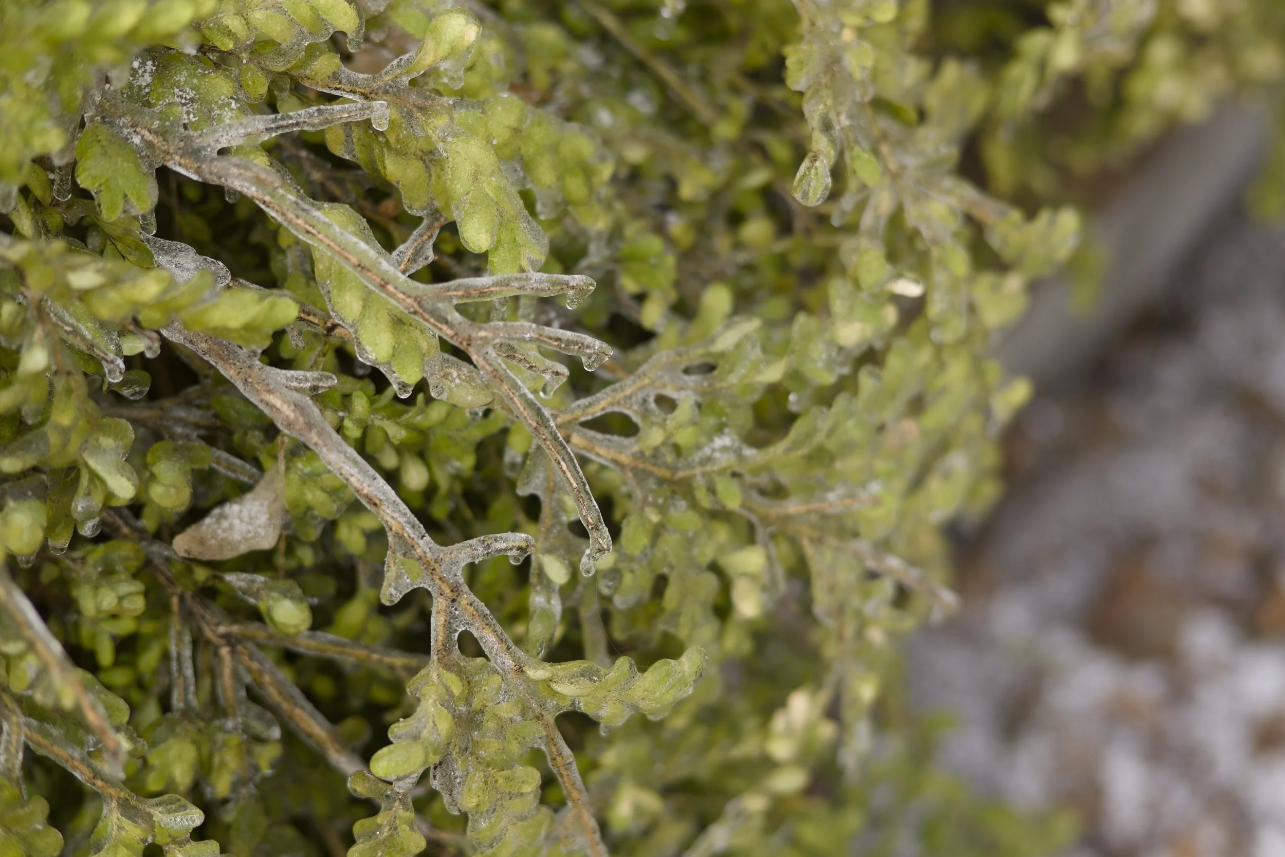 Cette récente « tempête de verglas » n’a pas été particulièrement sévère, mais elle a laissé derrière elle une végétation plutôt inhabituelle. Recouverte de glace, elle est vraiment frappante. Alors que je photographiais et marchais prudemment mon quartier avec un téléobjectif, je cherchais des clichés étranges et abstraits qui laissent les spectateurs s’interroger sur leur nature.