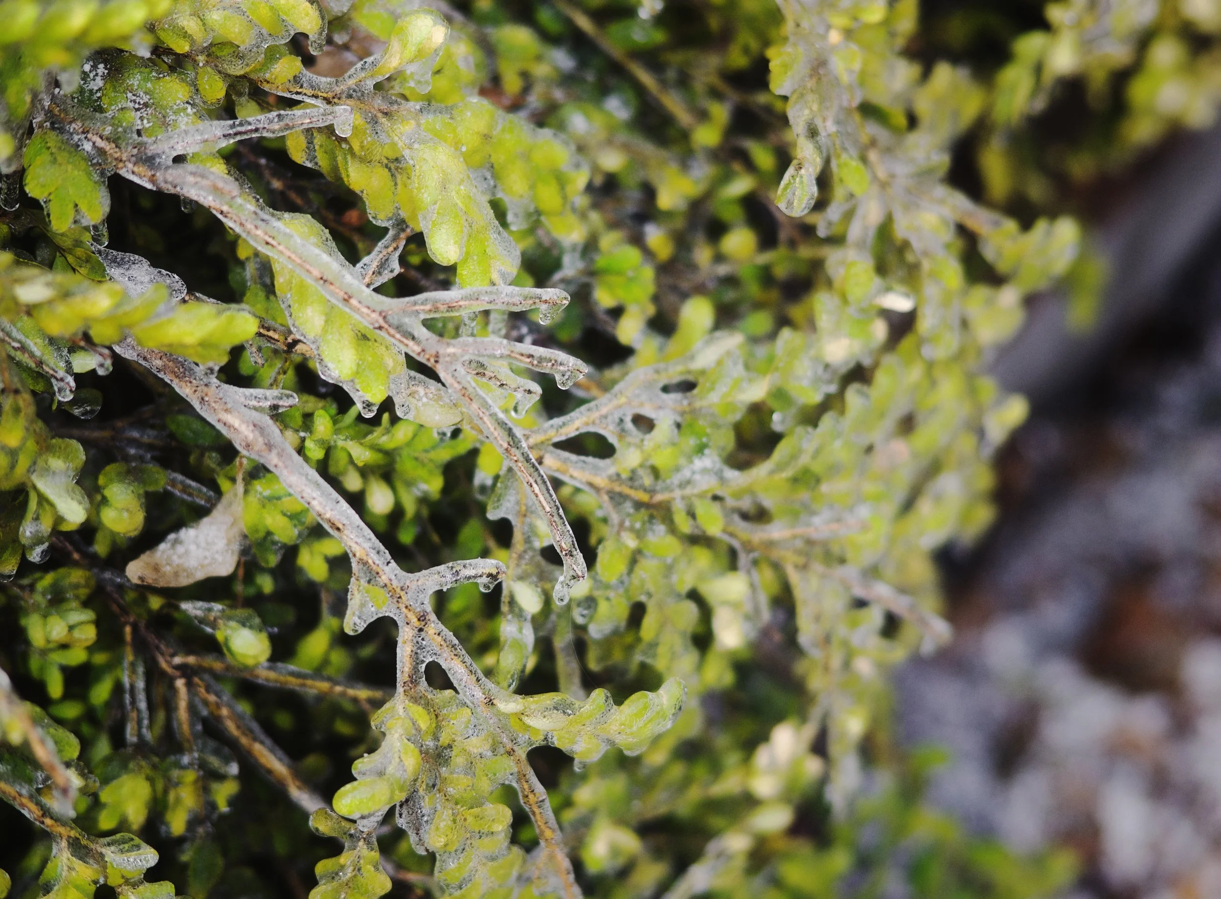This recent “ice storm” wasn’t particularly severe, but it did leave behind some rather unusual vegetation. Covered in ice, it’s quite striking. As I gingerly photographed my neighbourhood with a longer lens, I was on the lookout for strange, abstract shots that leave viewers wondering about their nature.
